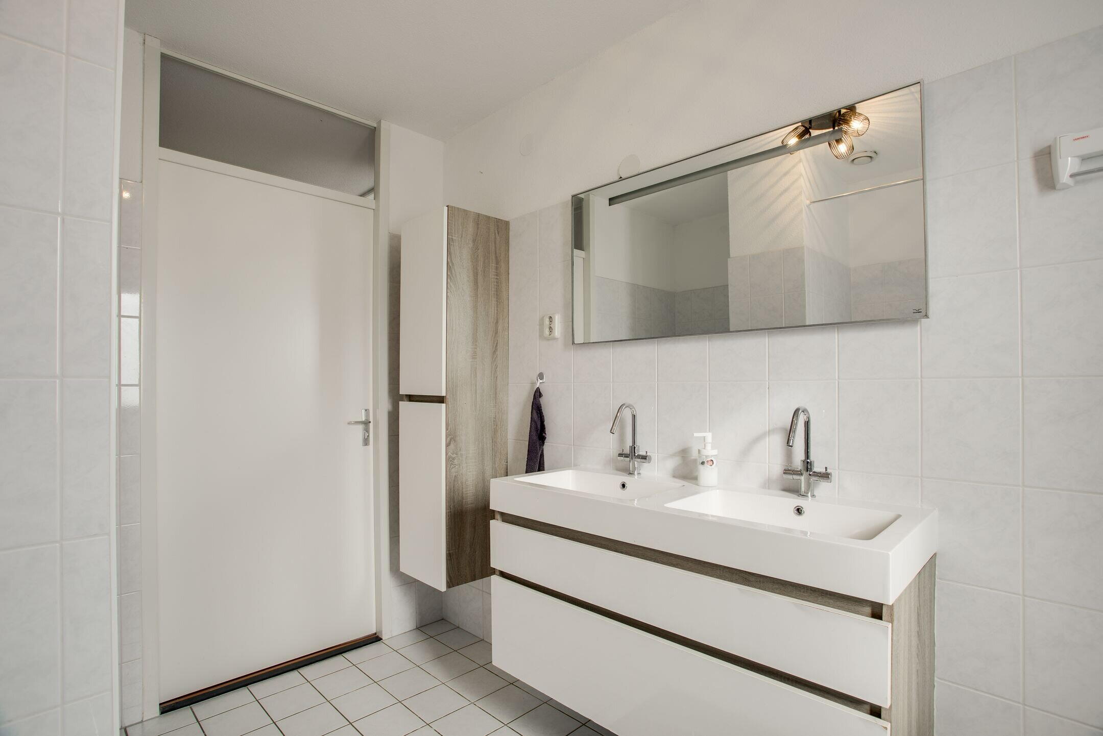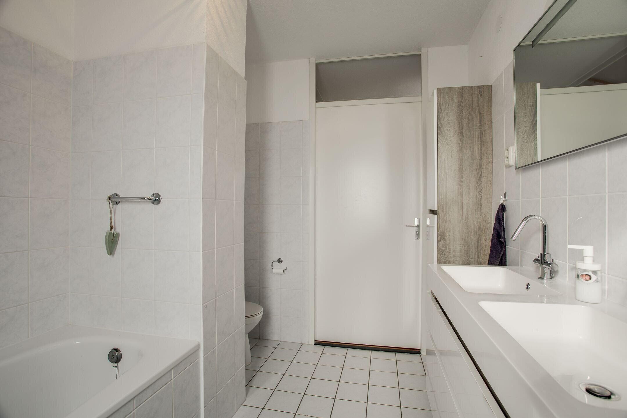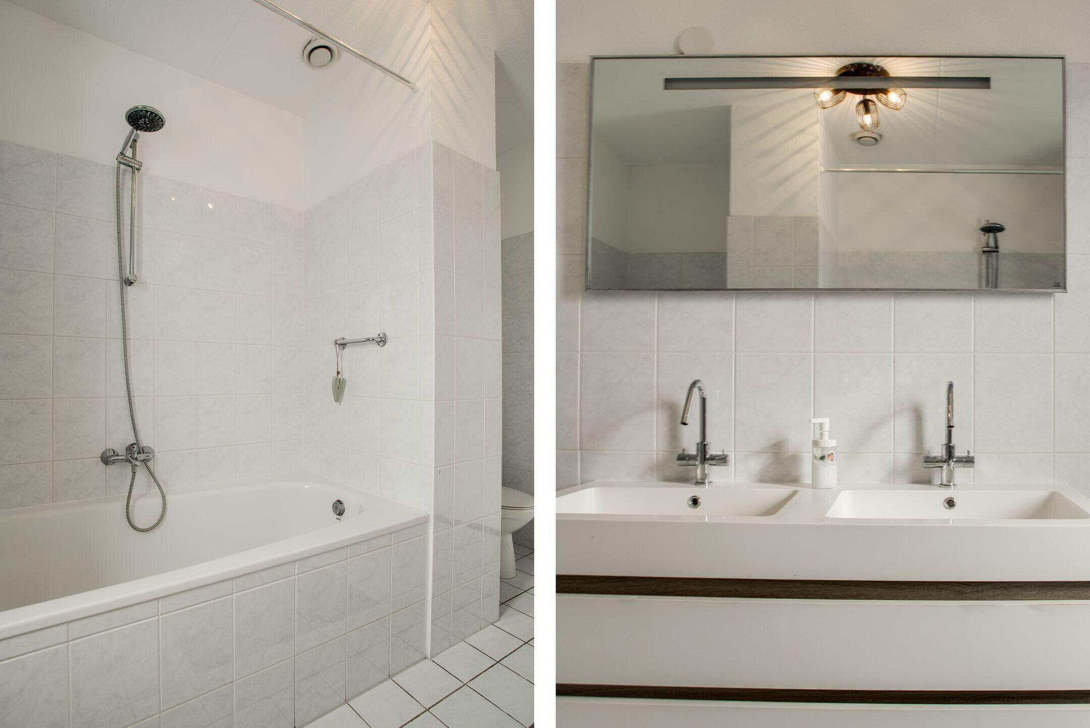 De badkamer is licht betegeld en compleet uitgevoerd met: